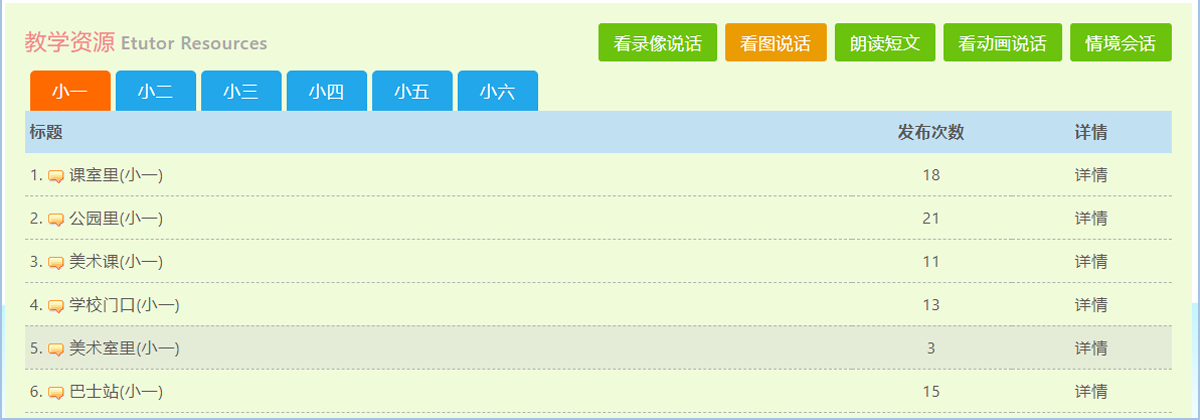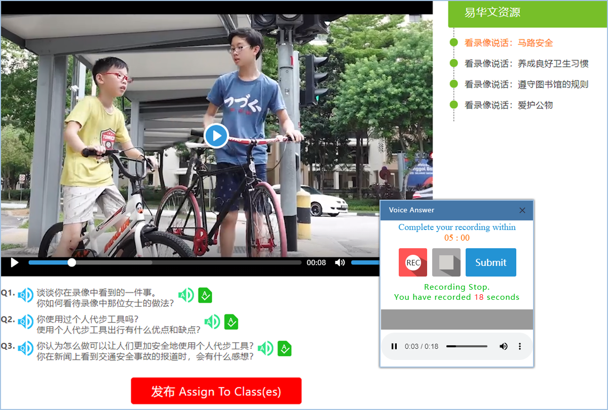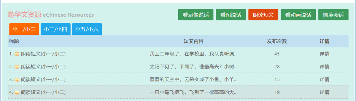 eOral口试资源与互动练习平台,配合新加坡小学一年级至六年级不同年级华文口试练习与考试要求,提供大量口试教学与练习资源,包括朗读短文、看图说话图片、看录像说话视频短片、口试动画视频,会话参考答案,老师教案简报PPT以及相关文本或参考答案的录音文档,满足不同年级的口试教学与练习需要,协助老师解决口试辅助教学材料不足的问题,避免选编教学材料花费大量时间及版权问题。