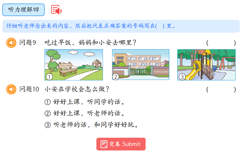 eListening is equipped with self-learning tools and functions such as automatic marking, grading, time counter and results recording.
